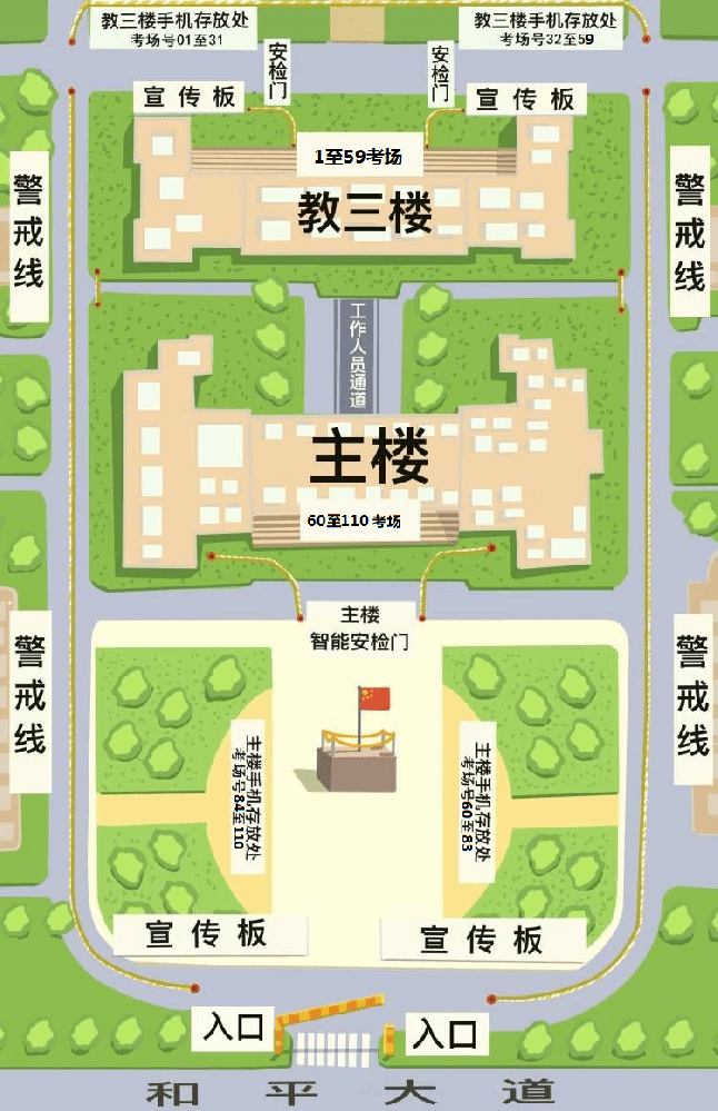 1.考生統(tǒng)一從和平大道東南門(一號(hào)門)專用通道進(jìn)出校園,行程途中按指示牌、工作人員指引路線到達(dá)考點(diǎn)大樓。考試結(jié)束后考生按工作人員的指令保持人員間距有序離場(chǎng)。