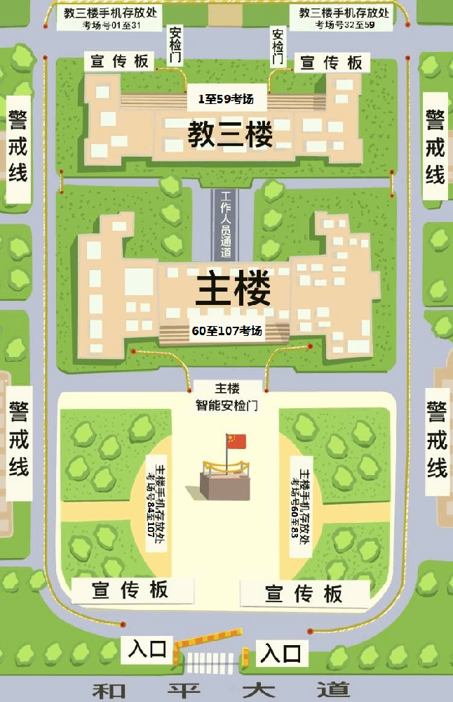 1.考生統一從和平大道東南門(一號門)專用通道進出校園,行程途中按指示牌、工作人員指引路線到達考點大樓??荚嚱Y束后考生按工作人員的指令保持人員間距有序離場。
