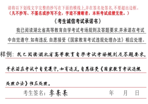 1.落實筆跡信息采集要求。考生應(yīng)在答題卡指定區(qū)域完整抄寫《考生誠信考試承諾書》(抄寫樣例如下圖),凡不抄寫、不簽名或抄寫不全,字跡不清晰者,該科考試成績無效。畢業(yè)時省教育考試院將對每張答題卡上的《考生誠信考試承諾書》筆跡進行復(fù)核,凡筆跡不一致、經(jīng)鑒定為代考的,將根據(jù)《國家教育考試違規(guī)處理辦法》作出成績作廢、延遲畢業(yè)、記入國家教育考試誠信檔案等處理。