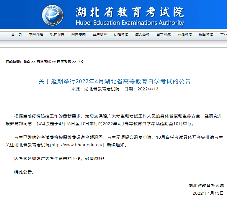 關于延期舉行2022年4月湖北省高等教育自學考試的公告
